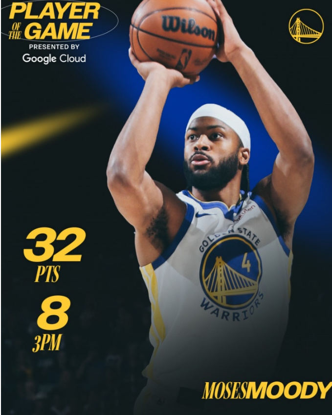 穆迪爆发夜!三分12中8砍32分创生涯新高,勇士最佳实至名归